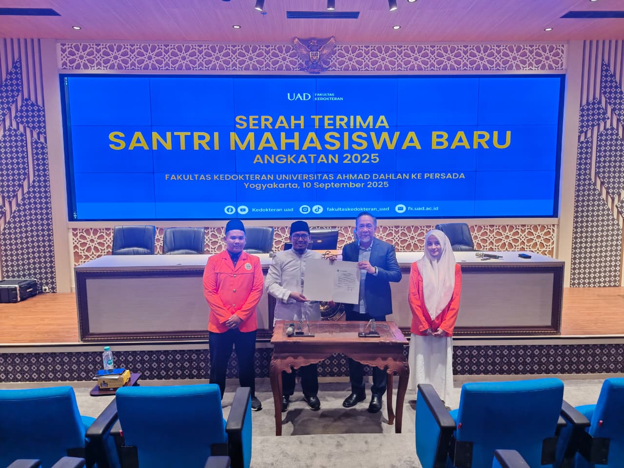 Yogyakarta, 10 September 2025 – Pesantren Mahasiswa KH. Ahmad Dahlan (PERSADA) Universitas Ahmad Dahlan (UAD) menggelar kegiatan Serah Terima Santri Baru Fakultas Kedokteran pada Rabu (10/9) di Amphitheater B, lantai 7 Gedung Kedokteran UAD. Acara ini dihadiri oleh jajaran Badan Pengurus Harian Persada, Wakil Dekan Fakultas Kedokteran, Ketua Program Studi (Kaprodi) Kedokteran, serta seluruh mahasiswa baru Program Studi Kedokteran.